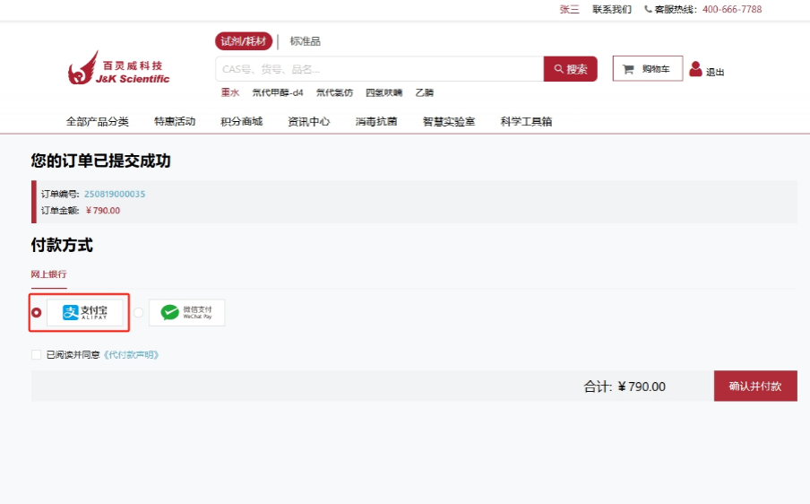 1)产品加入购物车之后,点击“去结算”,进入结算页面,选择“支付宝支付”即可进入支付页面