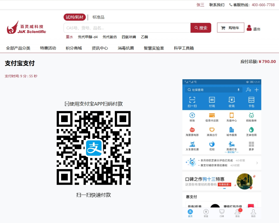 2)进入支付页面后,用手机扫描出现的二维码,进行支付宝付款