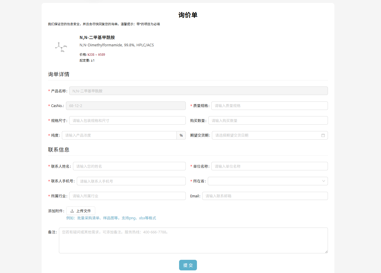 第二步:在询价页面提交产品信息,联系信息,点击提交按钮,我们会在1个工作日内与您联系;