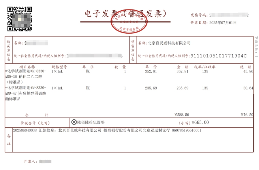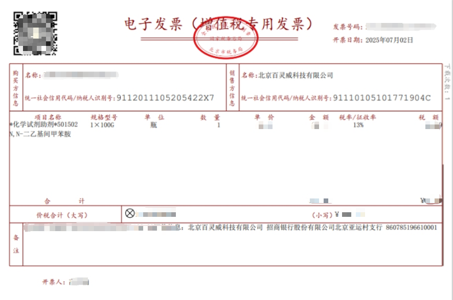 根据中国税法及税务管理部门的要求,百灵威提供增值税专用发票和普通发票(一般纳税人可开具增值税专用发票和普通发票,非一般纳税人或个人只可开具普通发票),所有百灵威开具的发票均合法有效。