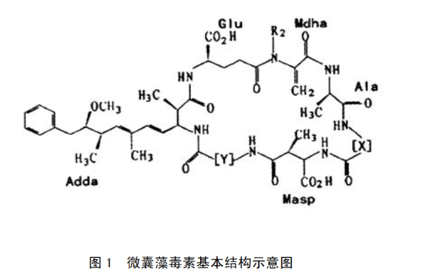微囊藻毒素(Microcystins,以下简称"MCs")主要是由铜绿徽囊藻、鱼腥藻、念珠藻、颤藻等几种能在水体中生长并形成水华的蓝藻类产生,由7个氨基酸组成的单环七肽化合物(分子基本结构如图1所示)。其中,Mdha是一种特殊氨基基酸;Adda为3-氨基-9甲氧-2,6,8-三甲基-10-苯-4,6-二烯酸;X和Y为2种可变氨基酸基团叫,x和Y的不同组合可以形成相应的异构体,目前已经发现了200多种不同类型的异构体(2)。MC-LR、MC-LR、MC-RR、MC-YR(L、R、Y分别代表亮氨酸、精氨酸和酪氨酸)为MCS异构体中最主要的3种,其中MC-LR、MC-RR在我国天然水体中检出频率和浓度最高。