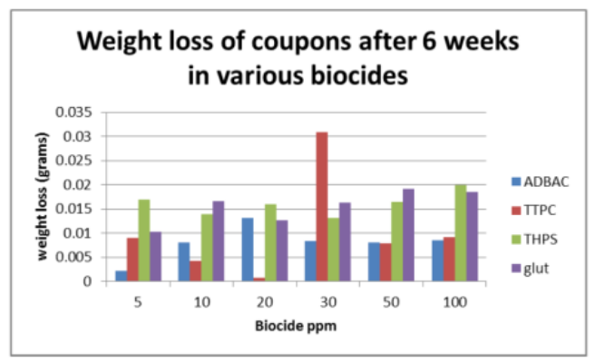 该化合物在低浓度(20ppm)下即展现出优异的长期抑菌性能。通过钢材试片的质量损失实验(图1)可见,相较于其他常用杀菌剂,该膦盐在六周后仍保持最佳防腐效果。这种长效控制机制能有效抑制浮游菌增殖,从而减少生物膜的形成。