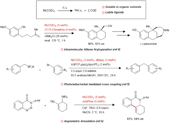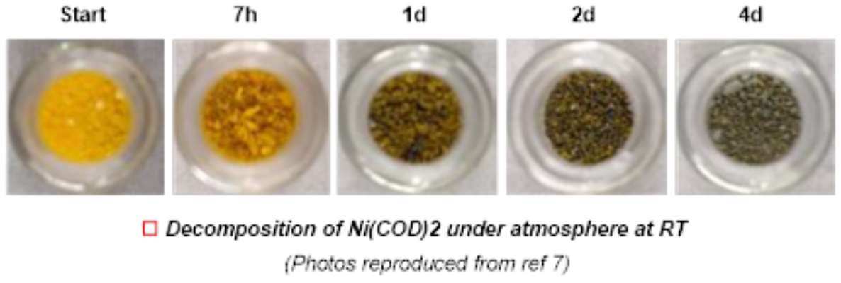 双(1,5-环辛二烯)镍(0)(28-0010),通常简称Ni(COD)₂,是由两个环辛二烯配体支撑的18电子d¹⁰零价镍配合物。该配合物最初由Guenther Wilke教授于1960年报道[1],其结构特征为四个烯烃C=C键以拟四面体构型排列于镍中心周围[2]。由于d轨道完全填充,Ni(COD)₂具有抗磁性,可通过核磁共振谱进行表征[3]。