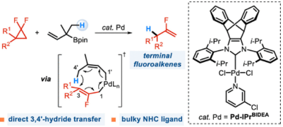 2024 年中国人民大学吕雷阳课题组在《美国化学会志》发表了一篇关于钯(Pd)/IPrBIDEA 催化的偕二氟环丙烷氢脱氟反应,实现了末端氟代烯烃的高区域选择性合成。该方法以 3,3 - 二甲基烯丙基频哪醇硼烷为新型氢化物供体,通过钯与 IPrBIDEA 配体的协同作用,精准调控偕二氟环丙烷的开环脱氟路径,突破了传统方法中 α- 取代模式的局限,以高选择性生成热力学不稳定的末端氟代烯烃。