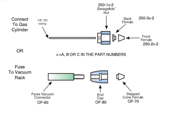 转塞的外螺纹及内槽可匹配1/8英寸(3.175毫米)口径Swagelok®接头和螺帽,方便接入高压气体管线。我们同时提供可选配的玻璃真空连接器(OF-60),便于连接橡胶真空管。