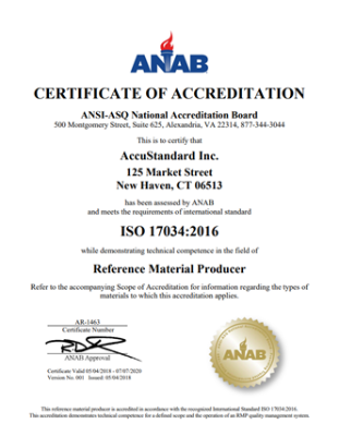 AccuStandard 成立于1986年,总部位于美国康乃迪克州,是国际认证参考物质(CRM)的领先制造商。产品热销全球130多个国家,产品线包括12,000多种参考标准品,24,000多种为客户订制的特殊组分参考标准品,用于农药、石化、环境、食品、日化、无机和烟草等检测领域。质量体系通过 ISO 9001 、 ISO 17034 和 ISO / IEC 17025 认证。