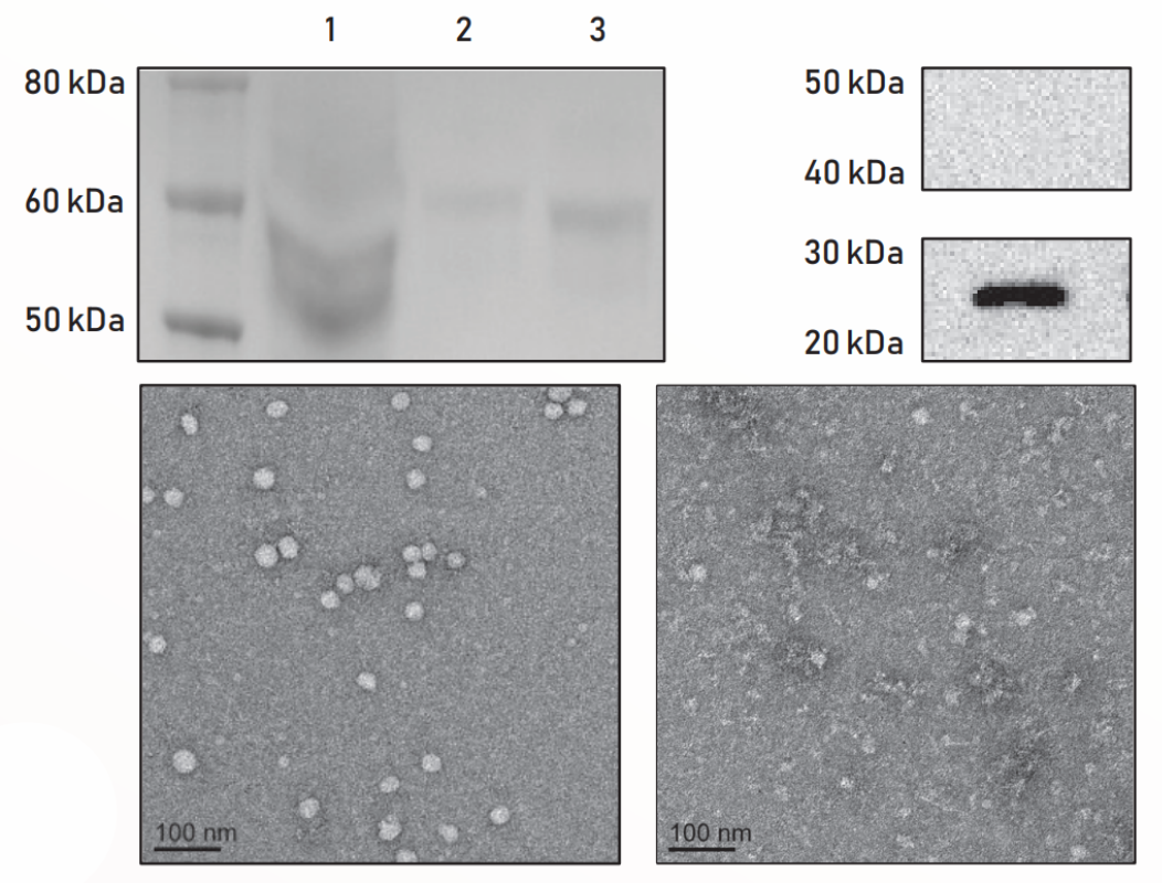 考马斯染色凝胶显示粗(1)和纯化(2)EV馏分。(3) 显示去除的污染物。(2)的Western印迹显示使用肌动蛋白和CD81的EV纯度的阳性和阴性对照。来自馏分(2)和(3)的电子显微镜图像显示纯化的EV和去除的污染物。