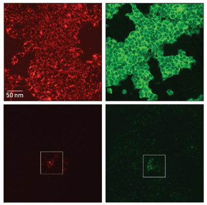 荧光图像显示标记的HEK细胞(顶部)和用标记的EV处理的细胞(底部)。