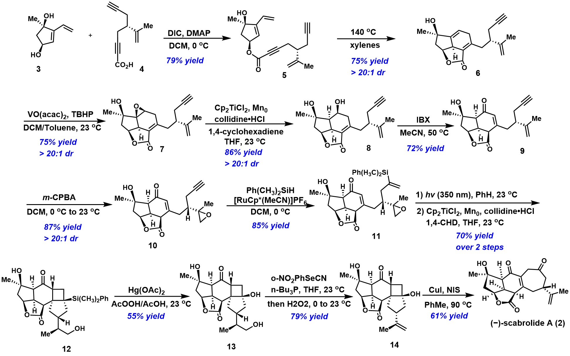 首先,(3) 和 (4) 在DIC和DMAP作用下缩合成酯 (5),(5) 在140 ℃下发生Diels–Alder环加成获得三环化合物(6),而后 (6) 在钒催化下发生环氧化获得砌块 (7)。其次,钛催化(7)种环氧开环获得二醇产物 (8),(8)利用IBX氧化即可构建烯醇砌块 (9),(9)中烯烃与m-CPBA发生环氧化合成(10)。随后,(10)发生钌催化的氢硅化反应构建化合物(11),(11)经光介导的环加成和钛催化环氧开环两步获得砌块(12)。最后,(12)通过汞介导 Tamao–Fleming反应合成(13),然后 (13)经Grieco 消除获得中间体(14),(14)在CuI和NIS的条件下发生氧化裂解构建环庚烷骨架获得天然产物(−)-Sscaprolide A(2)。