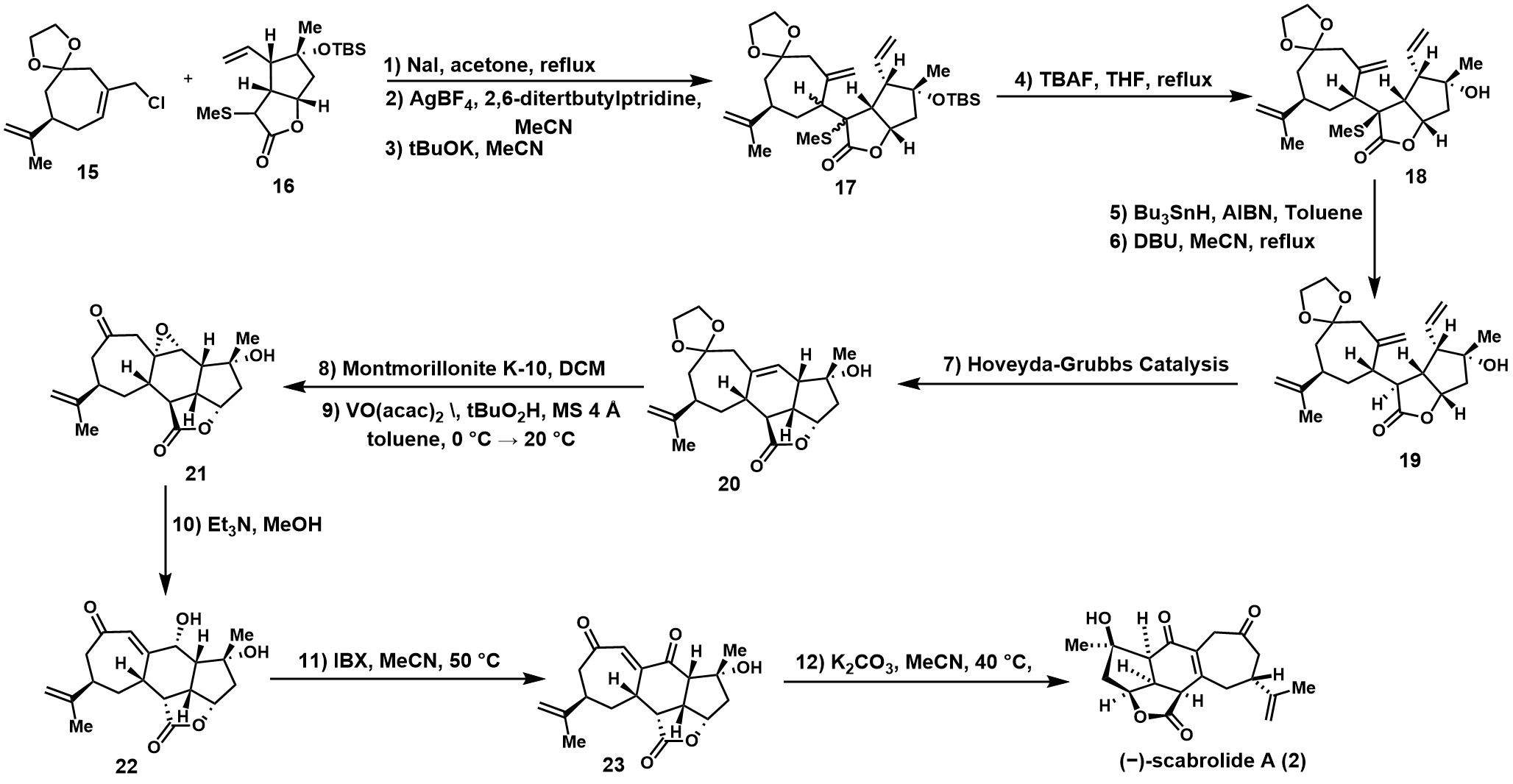 首先,(15) 和 (16) 通过取代、去质子化以及[2,3]-sigmatropic重排等三步获得中间体(17),而后(17)脱保护获得(18)。其次,(18)在Bu3SnH/AIBN处理和DBU存在下两步获得砌块(19),(19)发生烯烃复分解获得前体(20)。(20)经过脱保护和环氧化获得中间体(21)。随后,(20)通过环氧开环获得(22),(22)在经过IBX氧化、双键移位两步实现了天然产物Scabrolide A (2)的全合成