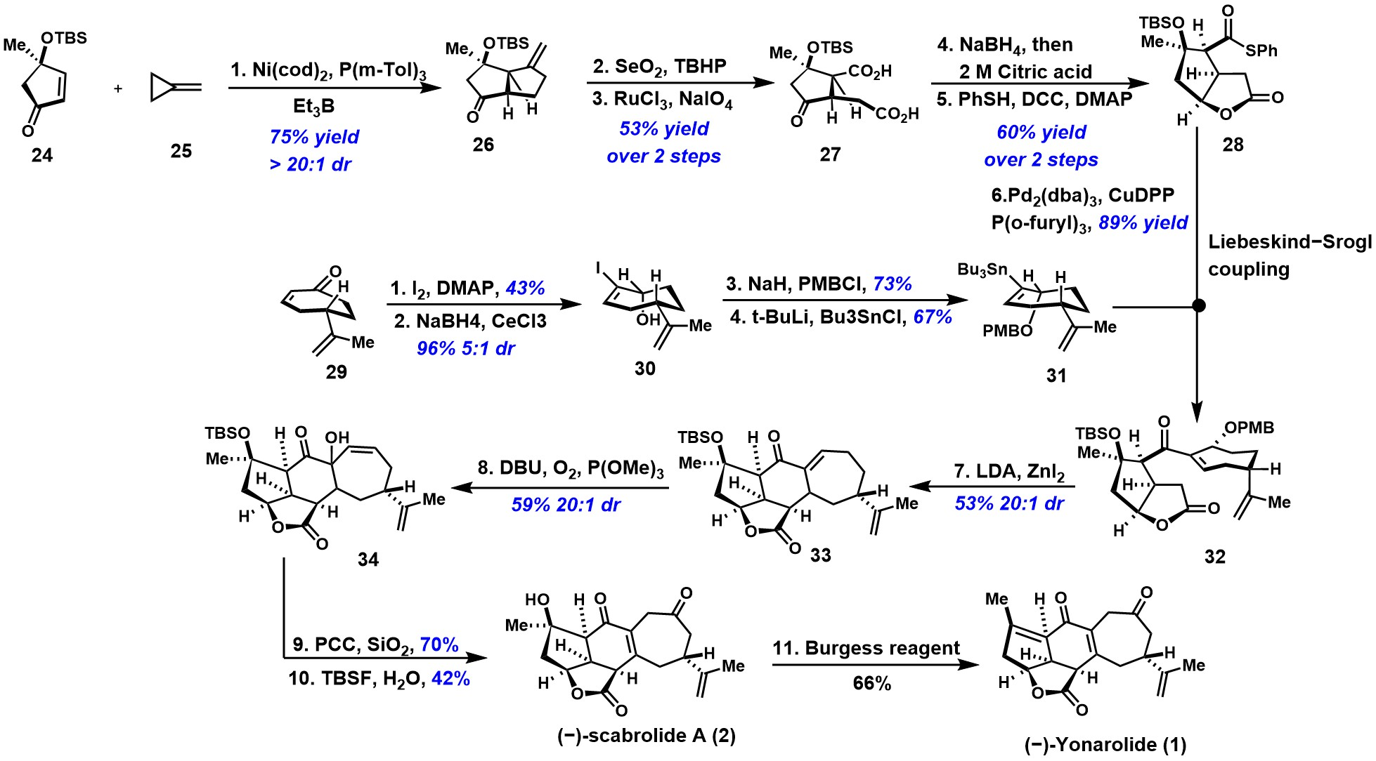 其次,(28)和(32)通过Pd/Cu催化的Liebeskind-Srogl偶联获得(33),(33) 在LDA/ZnI2 体系发生环化/消除串联反应合成中间体(34)。然后,(34)发生Rubottom氧化、PCC氧化以及TBSF介导的脱保护/异构化合成天然产物Scabrolide A (2)。最后,使用Burgess试剂处理Scabrolide A (2),即可获得天然产物(−)-Yonarolide(1)。