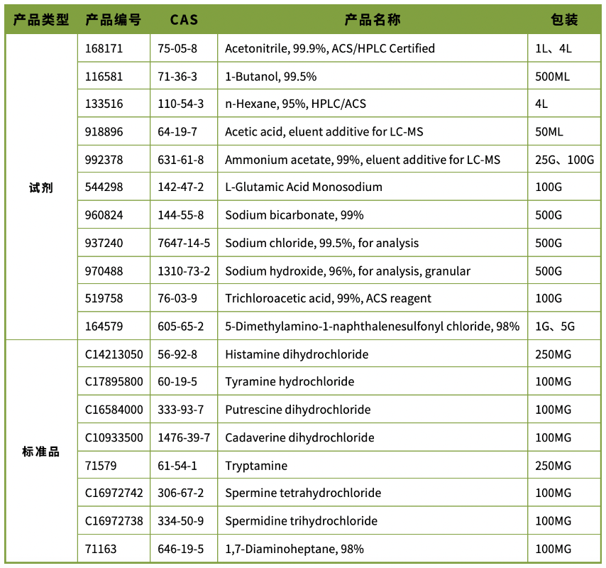 检测项目:色胺、β-苯乙胺、腐胺、尸胺、组胺、章鱼胺、酪胺、亚精胺和精胺含量