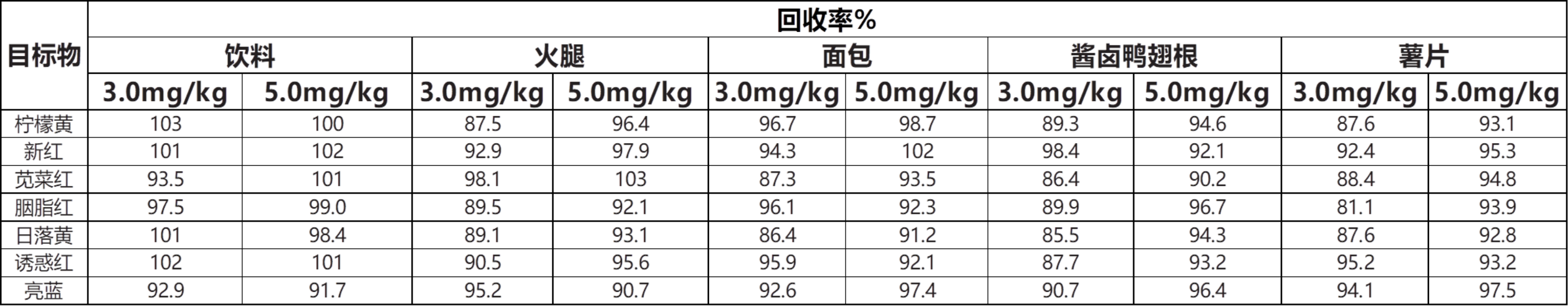 本方案以聚酰胺小柱为净化柱,通过高效液相色谱法测定食品中柠檬黄、日落黄、新红、胭脂红、苋菜红、诱惑红和亮蓝7种合成着色剂。方法操作简单,灵敏度高,能够满足日常检测需求。