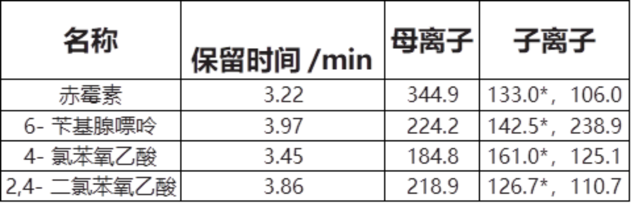 表2:组分、保留时间、特征离子对照表(*为定量离子)