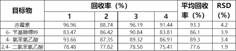 表3 豆芽中4种植物生长激素加标回收结果(25.0 µg/kg)