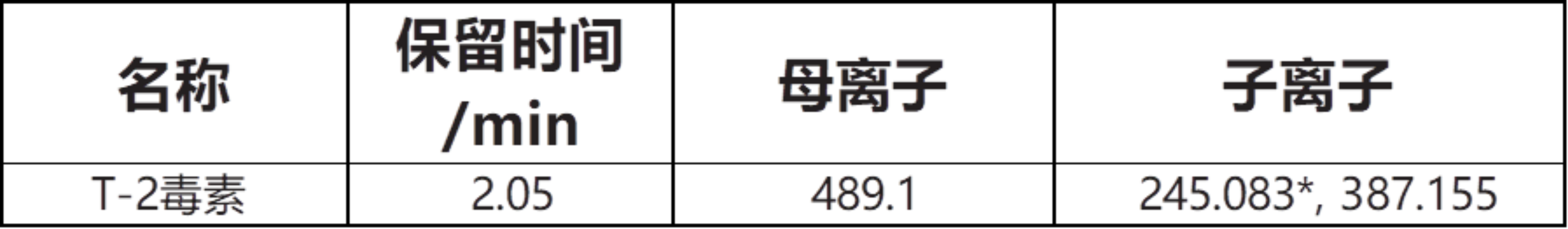 表2:组分、保留时间、特征离子对照表(*为定量离子)
