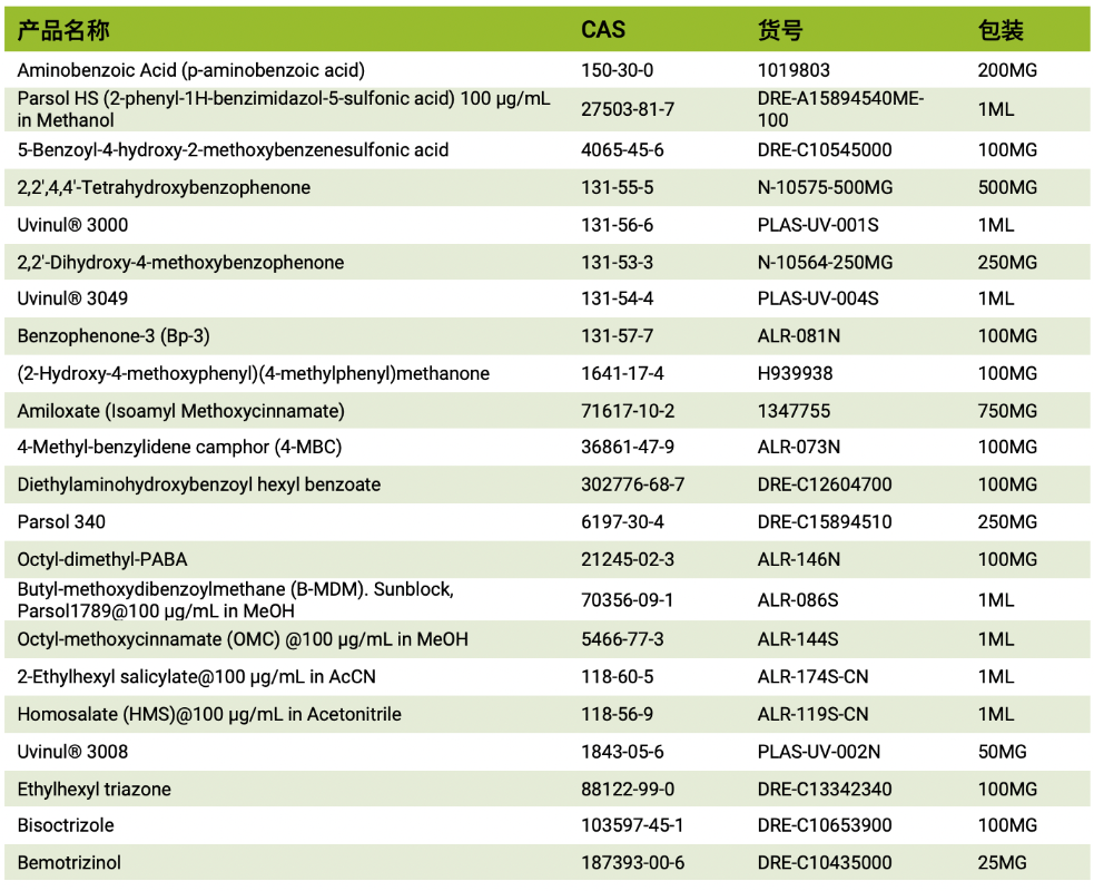 检测项目:苯基苯并咪唑磺酸、二苯酮-4、二苯酮-5、二苯酮-3、p-甲氧基肉桂酸异戊酯、4-甲基苄亚基樟脑、二乙氨羟苯甲酰基本甲酸乙酯、奥克利林、PABA乙基己酯、丁基甲氧基二苯甲酰基甲烷、甲氧基肉桂酸乙基己酯、水杨酸乙基己酯、胡莫柳酯、乙基己基三嗪酮、亚甲基双-苯并三嗪基四甲基丁基酚、双-乙基己氧苯酚甲氧苯基三嗪