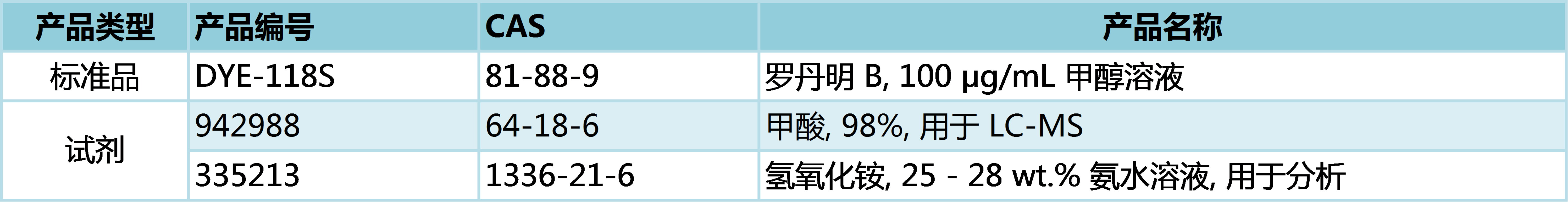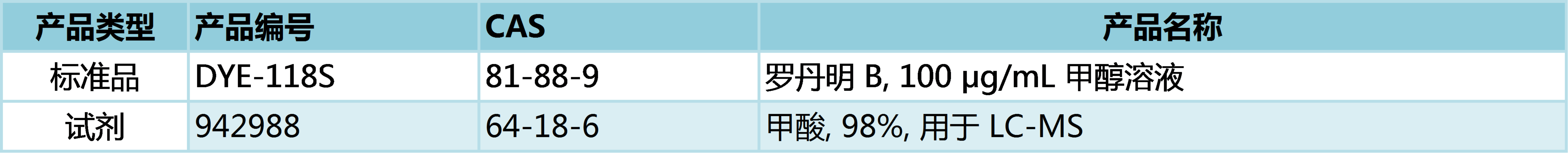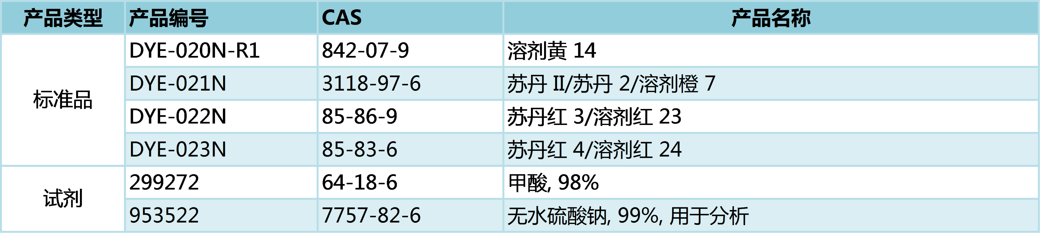 检测项目:苏丹红I、苏丹红II、苏丹红III、苏丹红IV