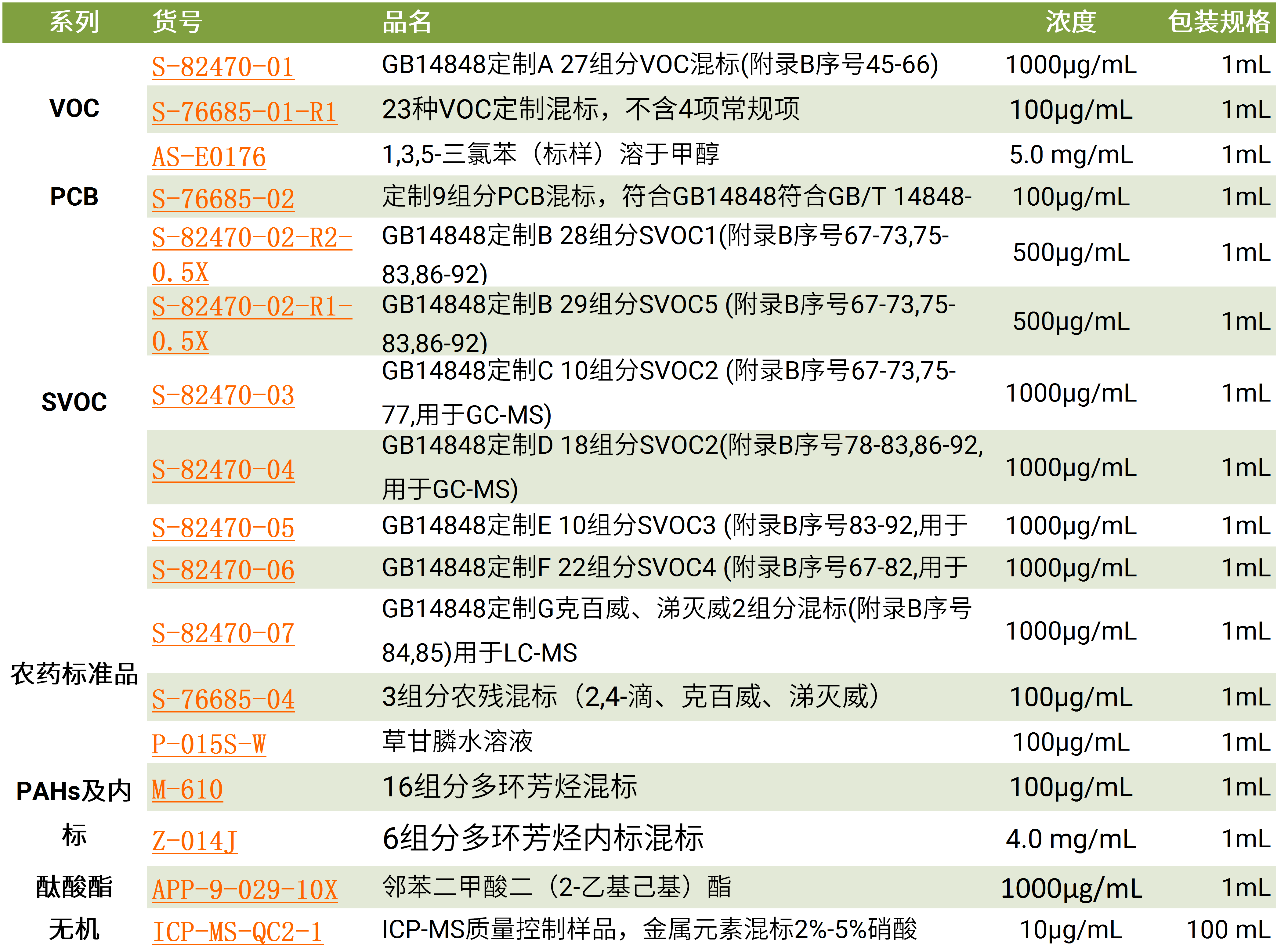 百灵威依据GB/T 14848-2017中检测指标及项目,提供适用GC-MS、LC-MS仪器的混标,满足各监测、检验单位对于不同标准品的需求。