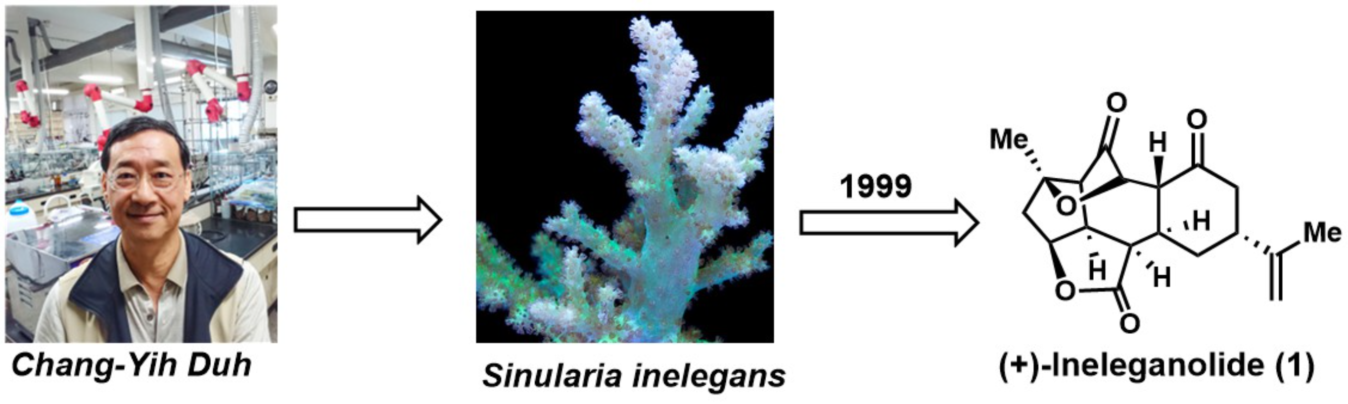 呋喃丁烯内酯(furanobutenolide)衍生的二萜(+)-Ineleganolide(1)是由中国台湾的化学家Duh及其同事于1999年从台湾的Formosan软珊瑚Sinularia inelegans中分离获得的一种对P-380白血病细胞系具有初步细胞毒性的物质(图1)[1]。虽然Vanderwal等人做出了努力[2],但由于 Ineleganolide 独特而具有挑战性的框架,在过去的二十年里, 其合成难题一直尚未解决。