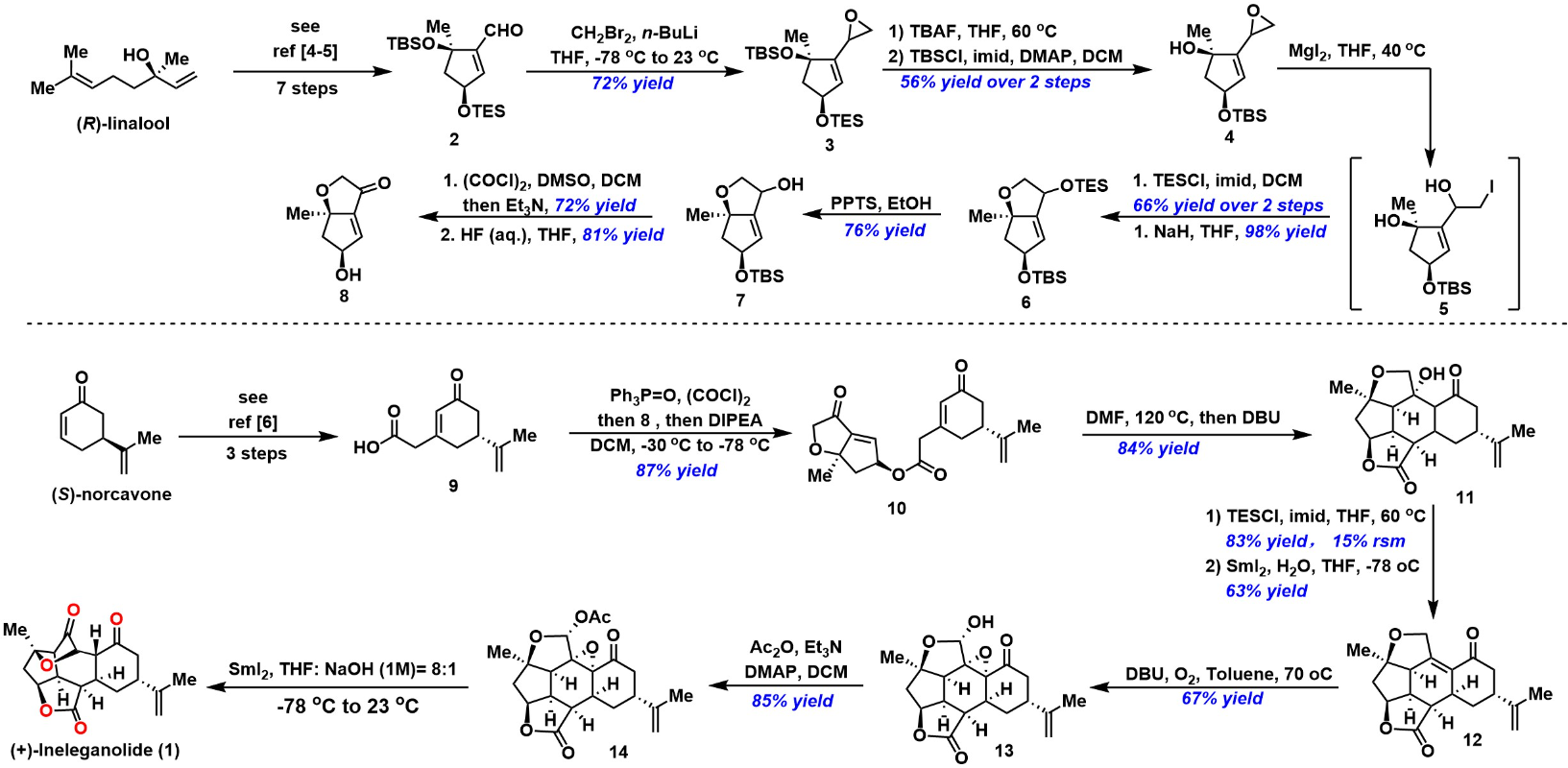 基于其特殊的骨架,目前仅有贝勒大学的John L. Wood教授[3]和加州理工学院Brian M. Stoltz教授分别以20步和23步线性最长步骤完成了二萜(+)-Ineleganolide的全合成。
