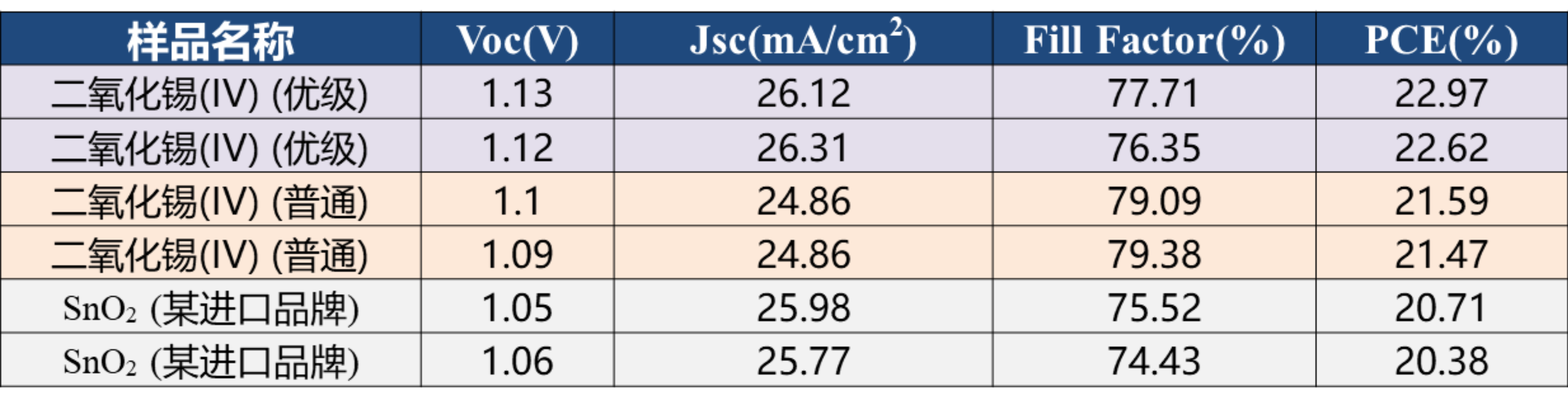 百灵威特别推出优级SnO2 水系分散液,批次质量稳定,经过多轮测试,器件性能得到显著提升[表1]。