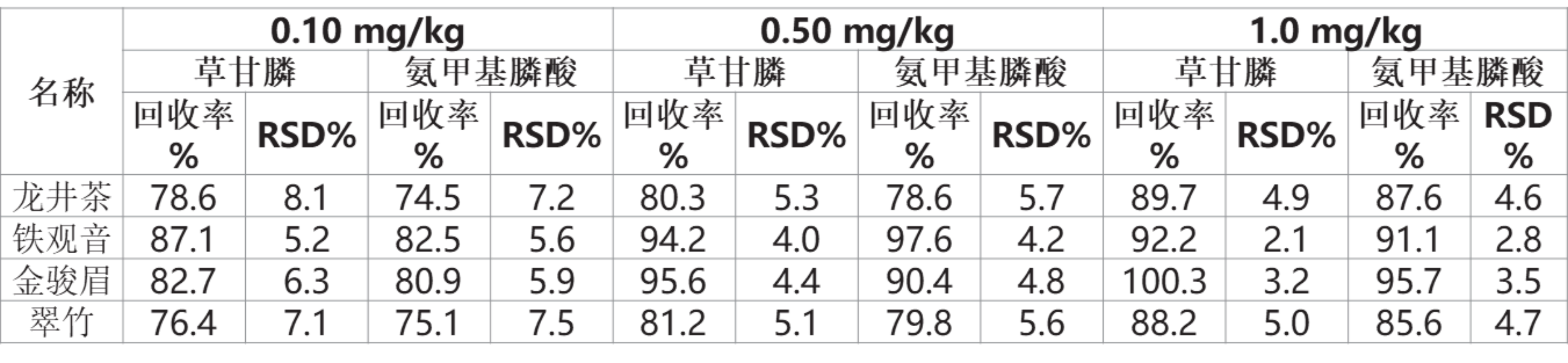 百灵威草甘膦专用柱应用方案包含完善的前处理条件及衍生条件优化过程,通过对红茶、绿茶、青茶等样品进行草甘膦检测验证,实验结果令人满意。