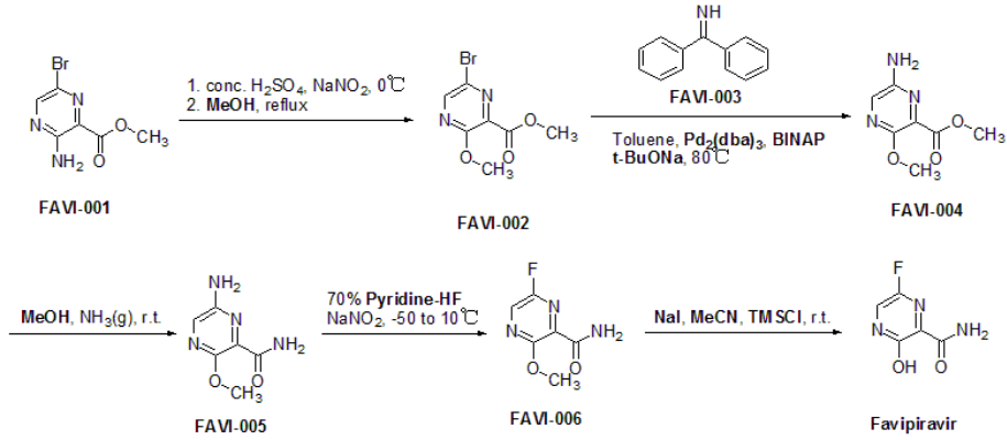 法匹拉韦由富山化学研发,于2014年3月24日获得日本医药品医疗器械综合机构(PMDA)批准上市,该药是一种RNA聚合酶抑制剂,通过抑制感染细胞的聚合抑制病毒基因复制,被批准用于治疗流感病毒感染。在此次爆发的2019-nCoV新型冠状病毒疫情中,科技部第一时间组织相关专家进行攻关,发现了磷酸氯喹、法匹拉韦以及中成药中一批具有抗病毒活性的上市药物[1]。法匹拉韦有望成为抗新型冠状病毒的明星药物之一。