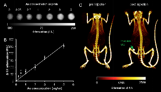 c. 较高的X射线散射能力:与碘相比,金具有较高的原子序数(Au 79, I 53)和X射线吸收系数(100 keV下,Au 5.16 cm2•g-1, I 1.94 cm2•g-1),单位质量的金与碘相比造影效果高约2.7倍。