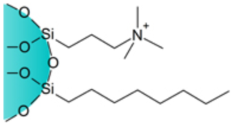 C8/SAX的官能团由按比例键合的辛基和季胺基组成,辛基提供中等疏水作用,季胺基提供强阴离子交换作用。